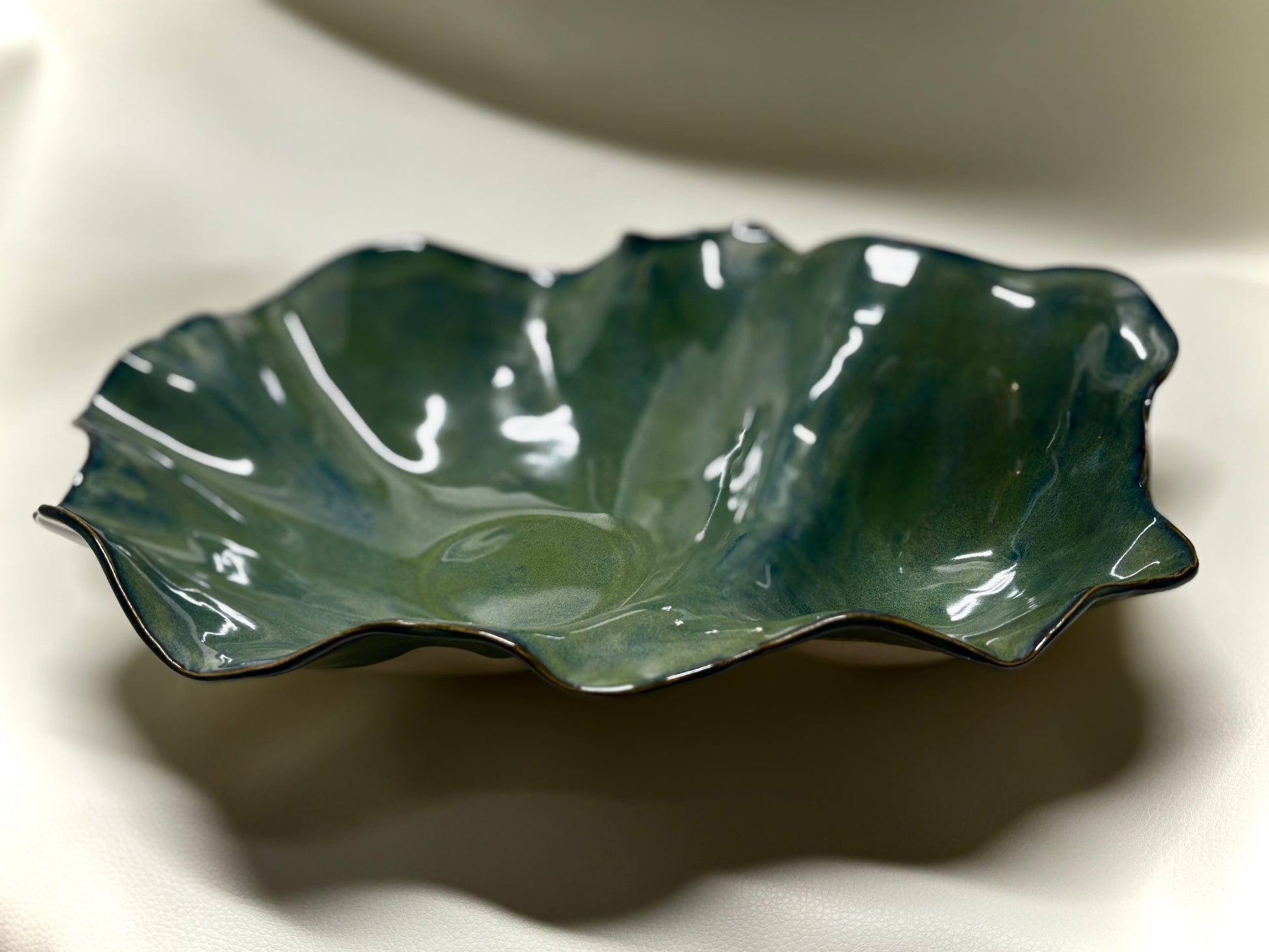 Hand-crafted from a porcelain blend, this elegant chip and dip bowl is designed with a flowing, petal-like rim and a glazed surface that shimmers in deep shades of green with natural variations. The central well is ideal for dips, while the surrounding dish provides ample space for chips, crackers, or vegetables. Both practical and eye-catching, this handcrafted piece brings a touch of artistry to entertaining and makes a perfect centerpiece for any occasion.
